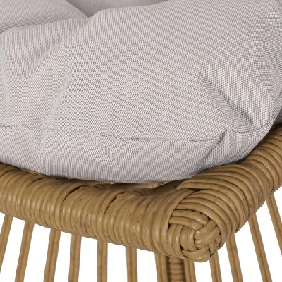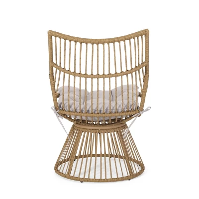Embrace the warm rays of the sun in the perfect seating arrangement for one. Featuring a chair with a refined high back design combined with a Papasan base, our chair and table set will be an excellent addition to any backyard or patio area. This lounge chair is perfectly paired with a cage frame side table, turning any outdoor space into a spectacular oasis. From tufted water-resistant cushions to its intricate wicker-wrapped finish, this set offers hours of relaxation for the summer-loving enthusiast.
