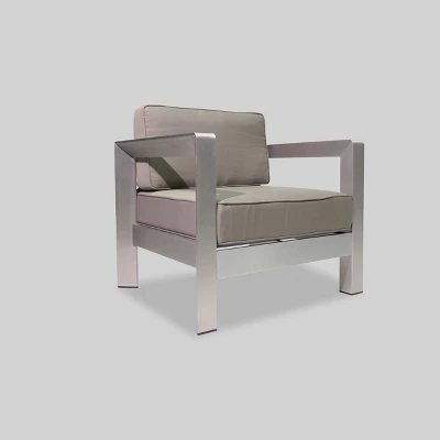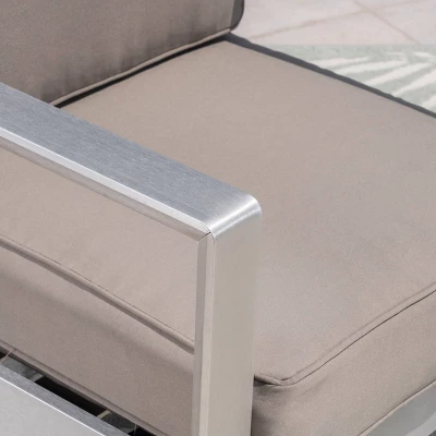 If you are cutting your evening soirees short because of chilly drafts and lack of light, this Christopher Knight Home Amata 5pc Aluminum Chat Set with Fire Pit and Tank Holder will solve that dilemma in an instant. Featuring smooth aluminum frames and water-resistant cushions, this set will have you and your guests lounging in complete comfort long after the sun has set. This perfect assemblage is centered around a sleek, modern fire pit and tank holder set with polish ceramic tops to bring your parties to the next level of sophistication.