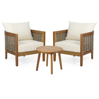 When selecting the perfect seating option for your outdoor space, go for quality and comfort. Our Chair and side table set combines rich acacia wood frames with intricate wicker accents to create a breezy oasis for your backyard or patio. With plush cushions and wonderfully curved frames, this set will have no problem blending into your outdoor decor with its streamlined style and durability.