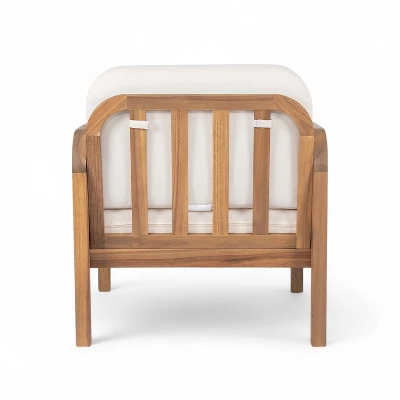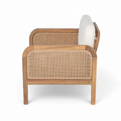 Relax in style with this beautifully crafted patio club chair, made from durable acacia wood and handwoven rattan for a warm, rustic look. Designed for outdoor comfort, it features a thick, 4.75-inch water-resistant cushion that offers excellent support and is easy to clean thanks to a zippered cover. The blend of natural textures and sturdy construction makes it a perfect addition to patios, decks, or garden lounges. Whether you’re entertaining guests or enjoying a quiet moment, this chair delivers lasting comfort and timeless outdoor elegance.