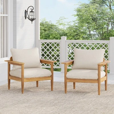 Bring comfort and natural style to your outdoor space with these patio acacia wood slatted club chairs. Crafted from durable acacia wood, each chair features a beautifully grained finish and a sturdy frame built to last. The slatted design adds a touch of rustic charm while promoting airflow for added comfort. Water-resistant cushions provide soft, supportive seating and are easy to maintain, making them perfect for outdoor use. Ideal for patios, gardens, or balconies, these chairs combine timeless design with functionality for a relaxed, stylish outdoor experience.