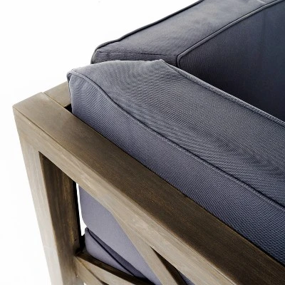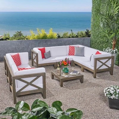 Are you a host or hostess with ambition? For the homemaker with more loved ones on their list than places to put them, this 8-seater outdoor sectional sofa set is the ultimate accommodation. Including a stylishly slatted square coffee table along with each piece of the sectional couch itself, this collection will help you create an atmosphere of easygoing leisure on your backyard deck or patio area and set the mood to enjoy the carefree fun of being outdoors for years to come. Each seating element is generously cushioned with water-resistant fabric and the acacia wood frames are low-profile and adorned with a modern cross-back design.
