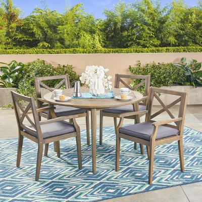 Pull your backyard barbeques out of the doldrums with this attractive outdoor dining set. The table is composed of acacia wood which is complemented tastefully by a set of four cushioned seats. Modern in design and completely weather-resistant, it is an investment that will give your summer evenings new life time and time again.