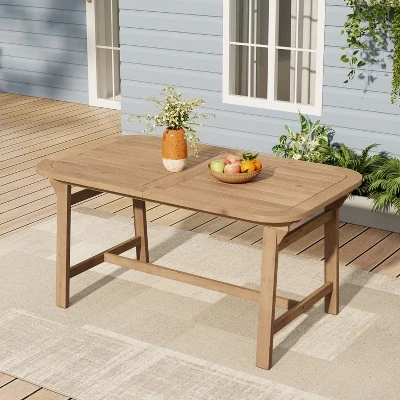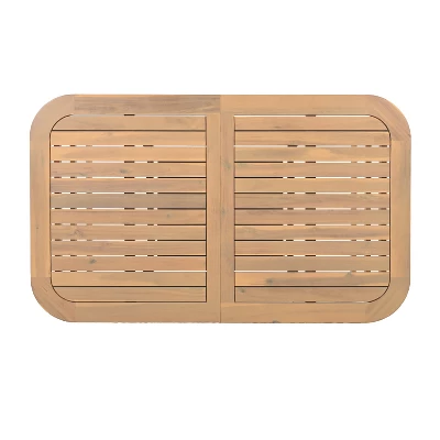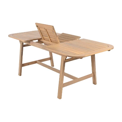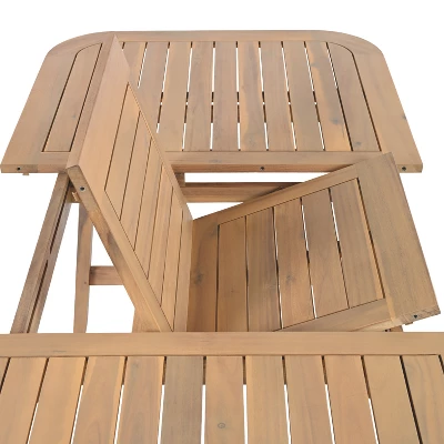 Host outdoor meals in style with this expandable acacia wood dining table. Adjustable from 59 to 79 inches, it comfortably seats up to eight guests. The slatted tabletop ensures breathability and quick drainage, while curved edges add elegance and safety. Reinforced leg construction boosts stability, and its weather-resistant build ensures year-round durability. Ideal for patios, backyards, or garden spaces, this table blends function, beauty, and long-lasting strength in one impressive design.