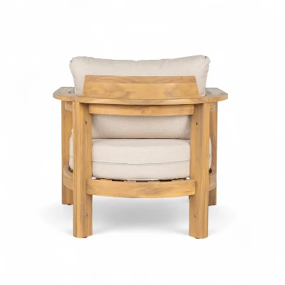 Crafted from premium acacia wood, this club chair features a unique tub design with an open slat back, blending timeless elegance with modern comfort. The durable, weather-resistant construction ensures long-lasting performance, while the ergonomic shape provides exceptional support. Perfect for patios, poolside lounging, or garden relaxation, its breathable slatted back enhances airflow for added comfort. The rich wood grain and sleek silhouette make it a stylish addition to any outdoor space. Easy to maintain and designed for both functionality and aesthetics, this chair elevates your outdoor living experience.