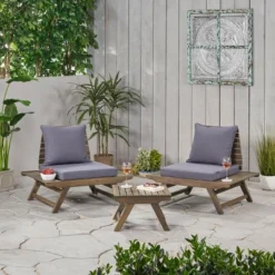 Create a cozy corner for your patio or deck space that also offers impeccable style to your décor. Featuring a wide seat panel and legs that angle outwards, our club chair and table set will be a flawless addition to any backyard or patio. This set features a wing-like structure offers extra space on either side of the seat cushion for a unique design. With solid acacia wood frames and plush outdoor cushions, this set offers hours of conversation for you and your guests.