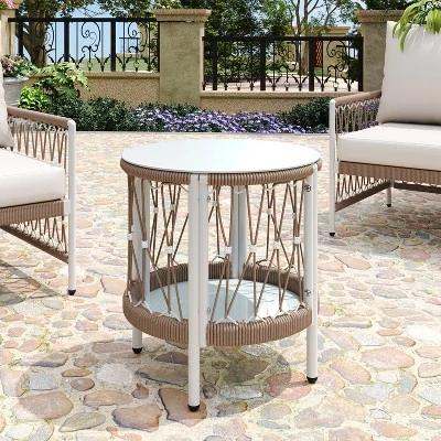 - BOHO-CHIC STYLE: This outdoor side table features handwoven rope details and a clean silhouette, delivering bohemian charm and modern simplicity—an ideal accent piece for patios, balconies, gardens, or poolside settings.