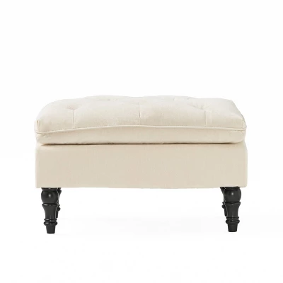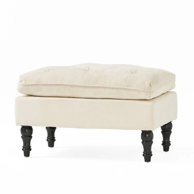Add a unique flair to your interior space with a little extra padding and charming style. Featuring a plush pillow top that is accented with delightful button tufting, our ottoman is the perfect addition to any living room. This is finished with lovely turned legs and inviting upholstery, giving your home an elegant touch. Whether you are propping up your feet after a long day or are in need of extra seating for your guests, this lovely ottoman has you covered.