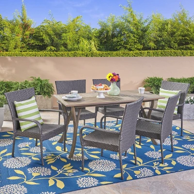 The beautiful blend of wood and wicker comes to life with this Christopher Knight Home Monterey 7pc Wood and Wicker Dining Set. Complete with six stacking wicker dining chairs, you can enjoy eating in your backyard whenever you want. The wooden table is treated to withstand even the harshest of seasons, ensuring your set looks great all year long. The rectangular table ensures that there is enough space for both food and people, meaning no one leaves the table hungry.