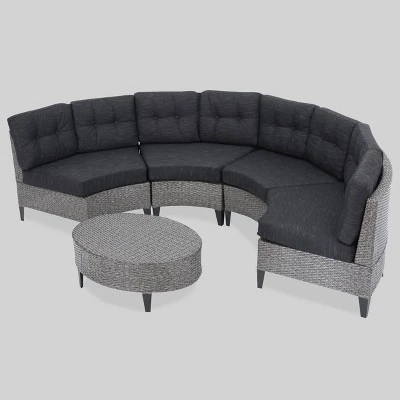 There is nothing quite like enjoying the warm outdoors in the comfort of this Christopher Knight Home Navagio 5 Pc Wicker Sofa Set. Constructed from durable top quality wicker, this set includes four curved two-seater sectionals that fit together to create a moon shaped lounge. This also has a matching table that can be nestled within or in front the sofa set. Whether arranged together or spaced apart, this Christopher Knight Home Navagio 5 Pc Wicker Sofa Set includes matching plush cushions that provide a comfortable experience for your guests.